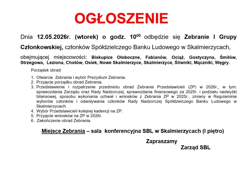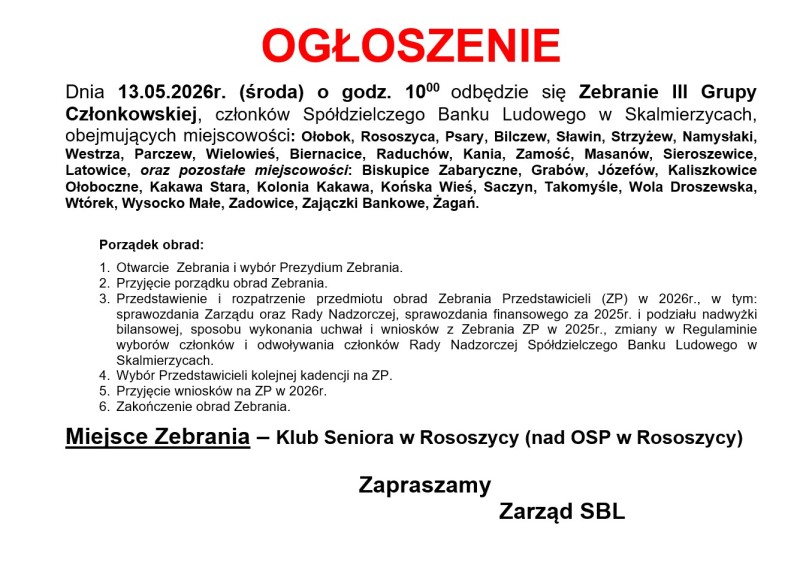 3.Przedstawienie i rozpatrzenie przedmiotu obrad Zebrania Przedstawicieli (ZP) w 2026r., w tym: sprawozdania Zarządu oraz Rady Nadzorczej, sprawozdania finansowego za 2025r. i podziału nadwyżki bilansowej, sposobu wykonania uchwał i wniosków z Zebrania ZP w 2025r., zmiany w Regulaminie wyborów członków i odwoływania członków Rady Nadzorczej Spółdzielczego Banku Ludowego w Skalmierzycach.