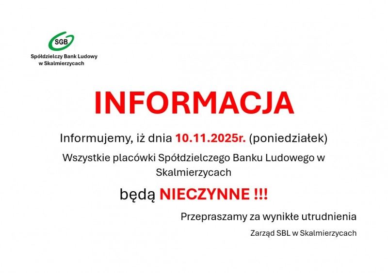 Szanowni Klienci, 10 listopada 2025r. nasze placówki będą zamknięte – zapraszamy do korzystania z bankowości internetowej oraz mobilnej.